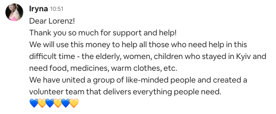 Nur einen Tag nach diesem Newsletter und Blogbeitrag wurde durch Airbnb die Möglichkeit, Wohnungen im Kriegsgebiet zu buchen und auf diese Art den Menschen vor Ort direkt zu spenden, unterbunden. Darauf erreichte mich folgende Nachricht von Iryna aus Kiew:
